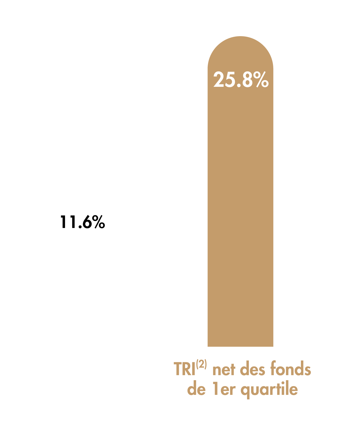 Une grande disparité de performance existe entre les fonds de Private Equity. Il est donc indispensable de sélectionner les équipes de Private Equiy présentant un track-record stable sur une longue période(1)